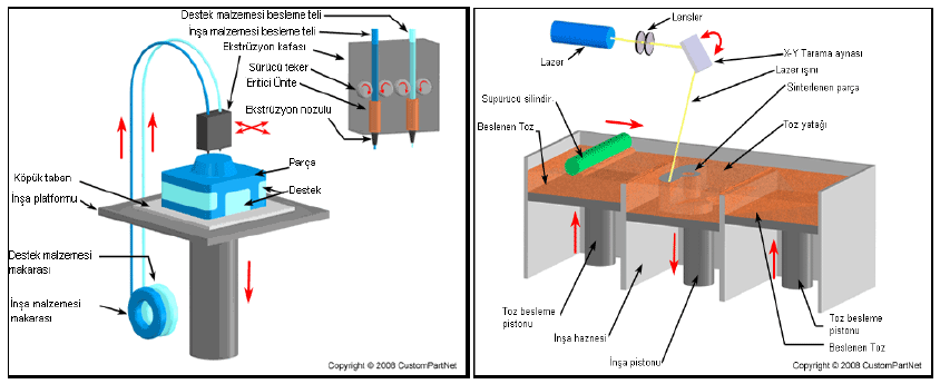 - SLS (Selective Laser Sintering, Seçici Lazer Sinterleme) yönteminin prensibi de katmanların imalatına dayanır. Ancak bu yöntemde farklı olarak, bilgisayardan alınan veriler referans alınarak toz halindeki malzeme lazer ışınıyla taranır. Eriyen ve eridiğinde birbirine kaynaşabilen toz kullanılır. Burada lazer ısıtma etkisini sağlar. Toz yığını üzerinde yalnızca ilgili katmanın geometrisi taranır, taramanın dışında kalan toz aynen kalır. Bu nedenle destek malzemesine gerek yoktur, malzemenin kendisi zaten destektir. Metal tozu da kullanılabileceği için burada imal edilen parçaların dayanımı FDM‘e göre yüksektir. Ancak maliyeti de FDM yöntemine oranla oldukça yüksektir.