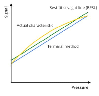 Doğrusal olmama, karakteristik eğrinin bir referans düz çizgisinden olası en büyük sapması (pozitif veya negatif) olarak adlandırılır. Referans düz çizgisini belirlemek için farklı yöntemler mevcuttur. Terminal yöntemi ve en uygun düz çizgi (BFSL) yöntemi en çok kullanılanlardır. Terminal yöntemi için referans çizgisi, karakteristik eğrinin başlangıç ve bitiş noktalarından geçer. BFSL referans çizgisi, en küçük kareler yöntemi kullanılarak belirlenir. Terminal yöntemi genellikle BSFL yönteminden iki kat daha büyük bir sapma ile sonuçlanır. Ölçüm aletlerini karşılaştırırken aynı yöntemin kullanılıp kullanılmadığını kontrol etmek önemlidir.