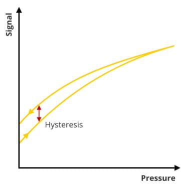 Karakteristik eğri, basınç kademeli olarak artırılarak ve ardından kademeli olarak azaltılarak kaydedilir. Kayıt, basınç artış ve azalma çizgilerinin tam olarak eşleşmediğini gösterecektir. Bu iki eğri arasındaki maksimum farka histerezis denir. Histerezis, enstrümanın malzemesinin elastik özelliklerinden ve enstrümanların kendisinin tasarımından kaynaklanır. Bu hata kullanıcı tarafından azaltılamaz. Daha düşük histerezis hatalarına ihtiyaç duyulursa üretici ile iletişime geçilmelidir.