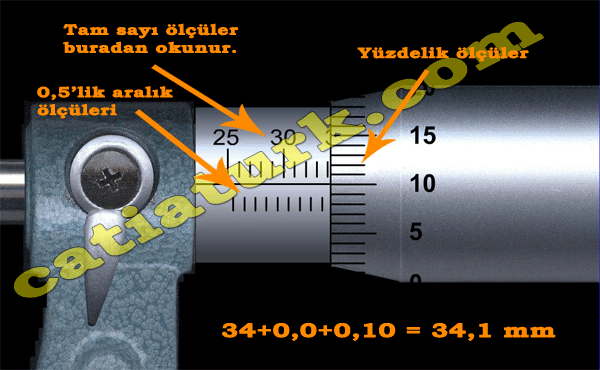 Örneğin; yukarıdaki resimde 25-50 mm ölçüm aralığı olan 0,01 mm hassasiyetli bir mikrometrenin okunma mantığı gösterilmiş. Burada kovan üzerinde bulunan 25,30,35,40,45,50 sayılarının bulunduğu üst tarafta kalan aralıklar okuyacağımız ölçüde virgülün sol tarafında kalacak olan yani tam sayı ölçüleridir. Yine kovan kısmında ölçüm eksen çizgisinin alt kısmında kalan ölçü aralıkları ise 0,5 mm ‘lik ölçü aralık çizgileridir. Bir de tamburun üzerinde 50 aralığa bölünmüş kısım vardır. Tam ölçüyü okumak için bu 3 kısımdan okuyacağımız değerleri toplarız. Bu örneğimizde ölçümüz, 34’ü biraz geçmiş olmasına rağmen 34,5 çizgisi görünmediğinden 34,5 mm’nin altında bir değer olduğu görünmektedir. Tambura baktığımızda ise ölçüm eksen çizgisinin 10 değerini tam olarak kestiğini görüyoruz. Bu durumda ölçümüz 34+ 0,0+ 0,10 = 34,1 mm olarak okunuyor. Eğer ölçüm çizgisinin altında kalan 34,5 çizgisi görünmüş olsaydı bu değer 34+0,5+0,1= 34,6 mm olarak belirlenmiş olacaktı.